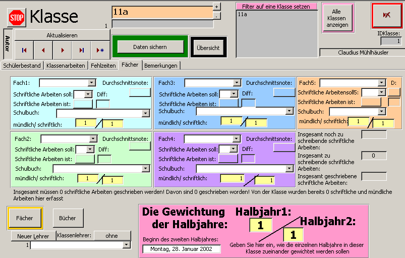 Sie können auch das eingeführte Schulbuch und den Klassenlehrer eintragen - das hat aber keinerlei Auswirkungen auf das Programm.