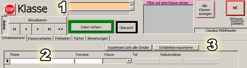 Das Feld "Klasse" wird vom Programm selbständig mit der Klasse gefüllt, die oben (1) angezeigt wird. - Bei der ersten Eingabe bleiben diese Felder programmtechnisch leer. Wenn Sie das Programm aber das nächste Mal aufrufen, wird die richtige Klasse angezeigt. Sollte ein Schüler Ihre Klasse verlassen, dann empfehle ich, dass Sie ihn nicht einfach löschen, sondern ihn eine "Reste"-Klasse überweisen, damit seine Daten weiterhin zugänglich bleiben.